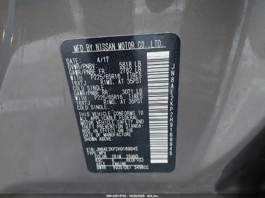 2017 NISSAN QUEST 2017 року Бензин, 3.5, Передній привід, vin - JN8AE2KP2H9169945 з США