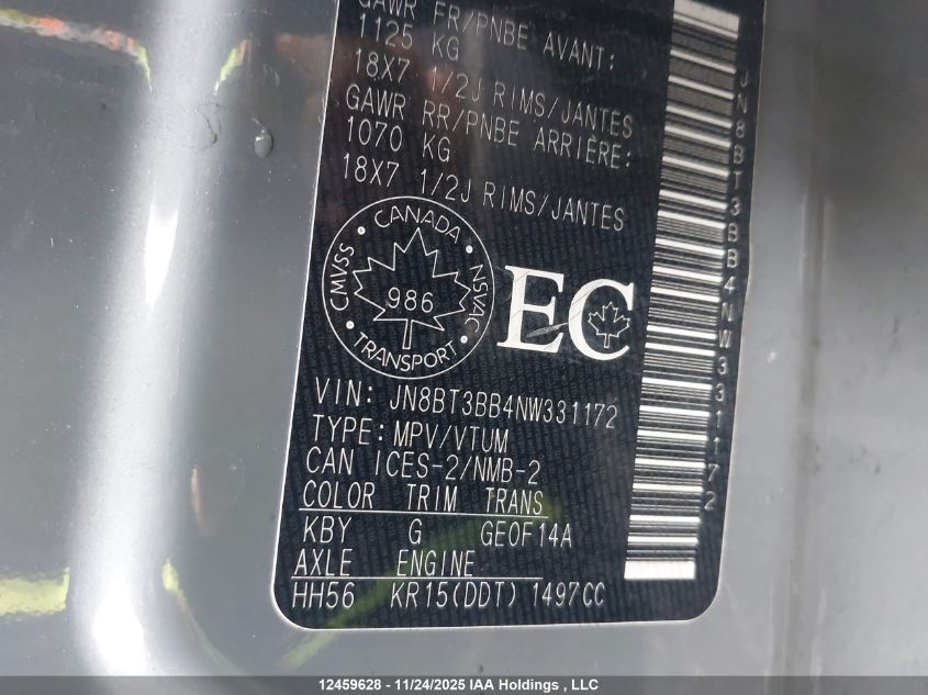 Колір СірийЦиліндри 3Привід Повний привідVIN JN8BT3BB4NW331172Стан ЗаводитьсяУшкодження Права сторонаДата аукціону 2025-12-08 AutoRIA