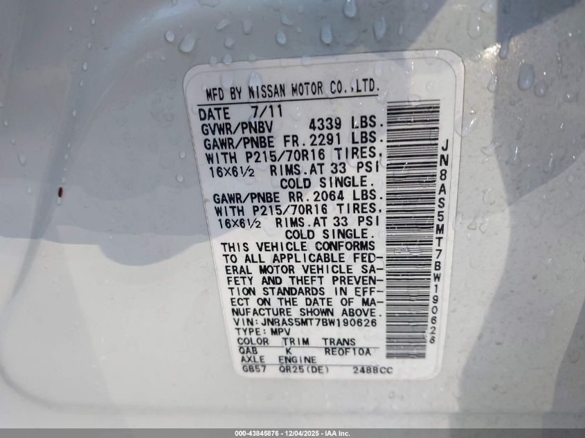 2011 NISSAN ROGUE 2011 року Бензин, 2.5, Передній привід, vin - JN8AS5MT7BW190626 з США