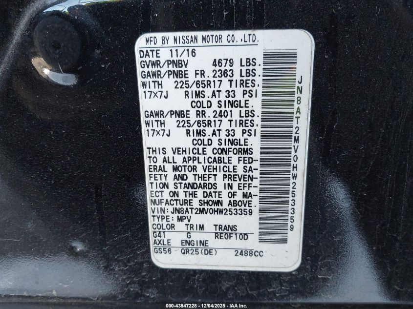 2017 NISSAN ROGUE 2017 року Бензин, 2.5, Повний привід, vin - JN8AT2MV0HW253359 з США