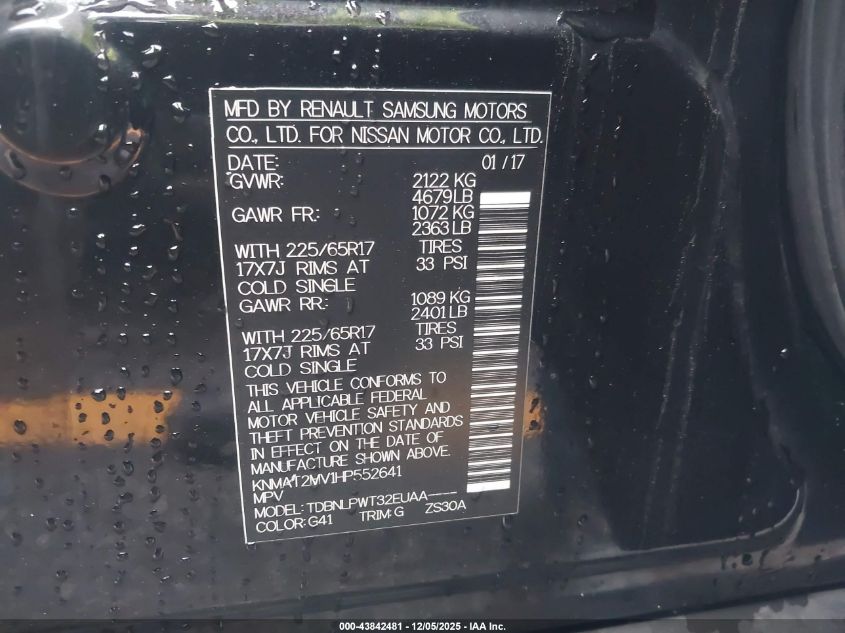 2017 NISSAN ROGUE 2017 року Бензин, 2.5, Повний привід, vin - KNMAT2MV1HP552641 з США