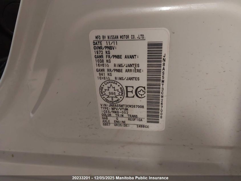 Колір БілийЦиліндри 4Привід Передній привідVIN JN8AS5MT3CW267008Стан ЗаводитьсяУшкодження Передня ліваДата аукціону 2025-12-10 AutoRIA
