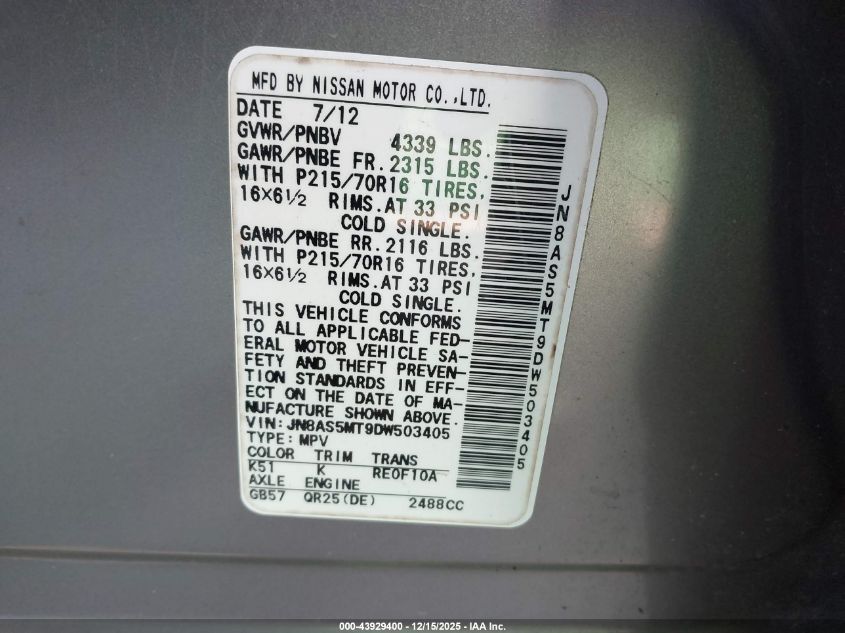 2013 NISSAN ROGUE 2013 року Бензин, 2.5, Передній привід, vin - JN8AS5MT9DW503405 з США