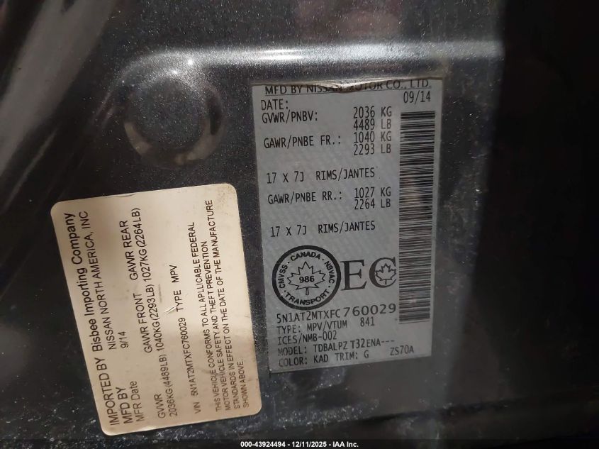 2015 NISSAN ROGUE 2015 року Бензин, 2.5, Передній привід, vin - 5N1AT2MTXFC760029 з США