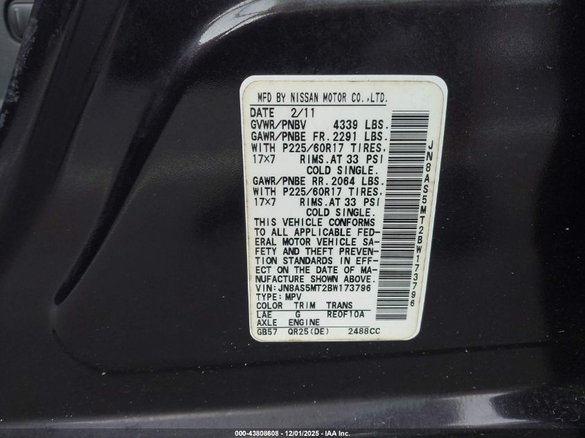 2011 NISSAN ROGUE 2011 року Бензин, 2.5, Передній привід, vin - JN8AS5MT2BW173796 з США