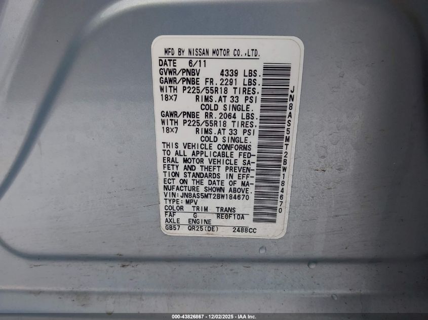 2011 NISSAN ROGUE 2011 року Бензин, 2.5, Передній привід, vin - JN8AS5MT2BW184670 з США