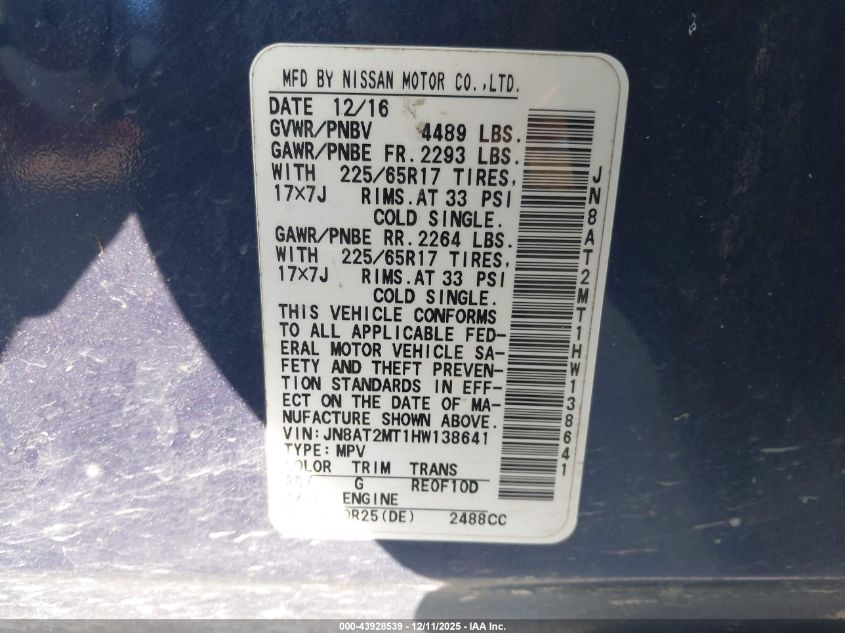2017 NISSAN ROGUE 2017 року Бензин, 2.5, Передній привід, vin - JN8AT2MT1HW138641 з США