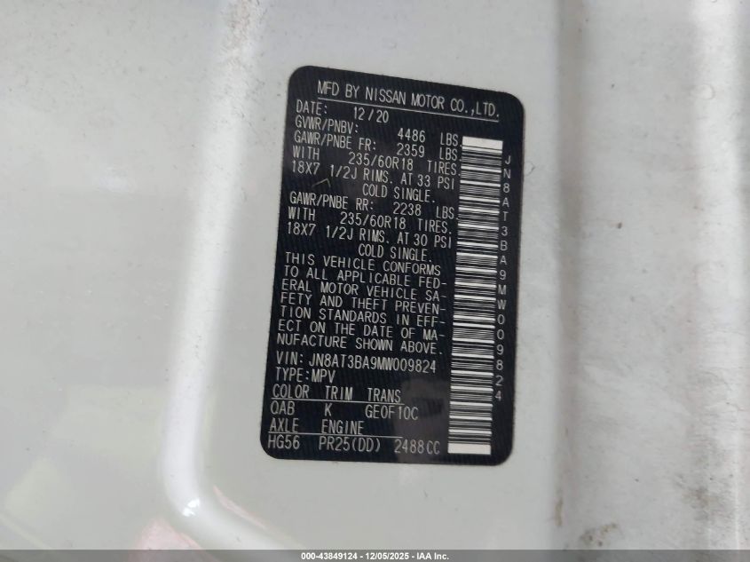 2021 NISSAN ROGUE 2021 року Бензин, 2.5, Передній привід, vin - JN8AT3BA9MW009824 з США