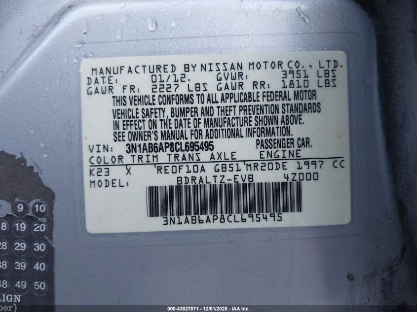 2012 NISSAN SENTRA 2012 року Бензин, 2.0, Передній привід, vin - 3N1AB6AP8CL695495 з США