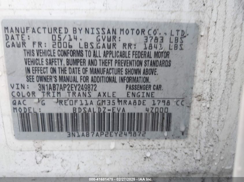 2014 NISSAN SENTRA 2014 року Бензин, 1.8, Передній привід, vin - 3N1AB7AP2EY249872 з США