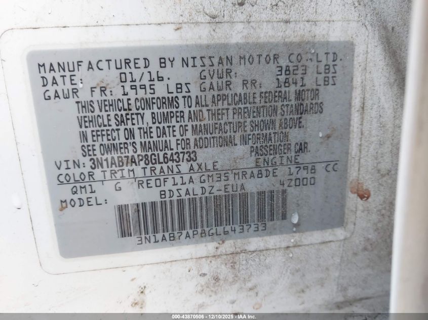 2016 NISSAN SENTRA 2016 року Бензин, 1.8, Передній привід, vin - 3N1AB7AP8GL643733 з США