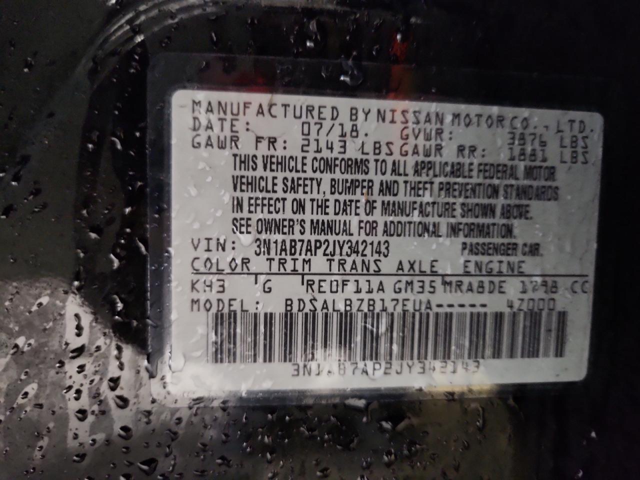 Колір ЧорнийЦиліндри 4VIN 3N1AB7AP2JY342143Стан Заводиться та їде (перевірено)Ушкодження Передня або задняДата аукціону 2025-12-09 AutoRIA