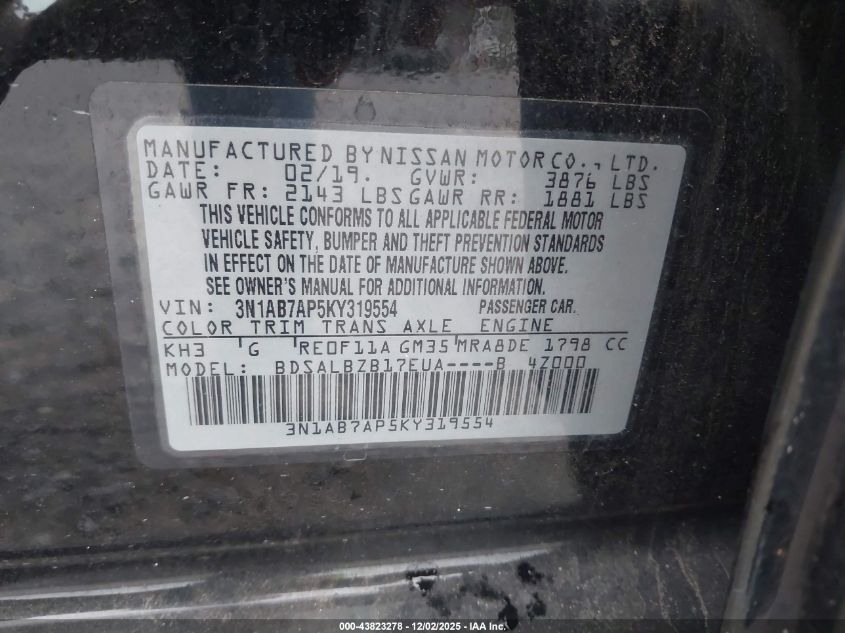 2019 NISSAN SENTRA 2019 року Бензин, 1.8, Передній привід, vin - 3N1AB7AP5KY319554 з США