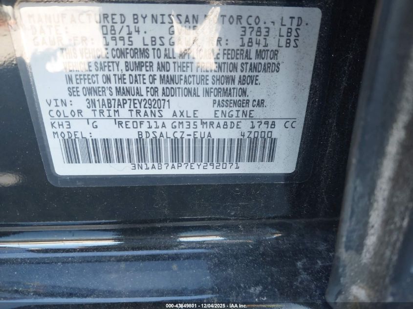 2014 NISSAN SENTRA 2014 року Бензин, 1.8, Передній привід, vin - 3N1AB7AP7EY292071 з США