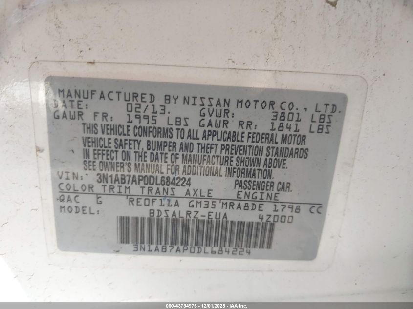 Колір БілийЦиліндри 4Привід Передній привідVIN 3N1AB7AP0DL684224Стан Заводиться та їде (перевірено)Ушкодження Права сторонаДата аукціону 2025-12-16 AutoRIA