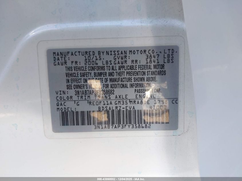 Колір БілийЦиліндри 4Привід Передній привідVIN 3N1AB7AP3FY358682Стан СтаціонарноУшкодження Передня або задня AutoRIA