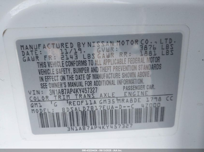 Колір БілийЦиліндри 4Привід Передній привідVIN 3N1AB7AP4KY457327Стан Заводиться та їде (перевірено)Ушкодження Права сторонаДата аукціону 2025-12-08 AutoRIA