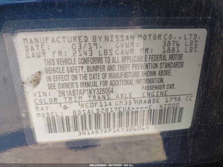 2019 NISSAN SENTRA 2019 року Бензин, 1.8, Передній привід, vin - 3N1AB7AP1KY326064 з США