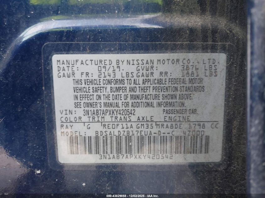 2019 NISSAN SENTRA 2019 року Бензин, 1.8, Передній привід, vin - 3N1AB7APXKY420542 з США
