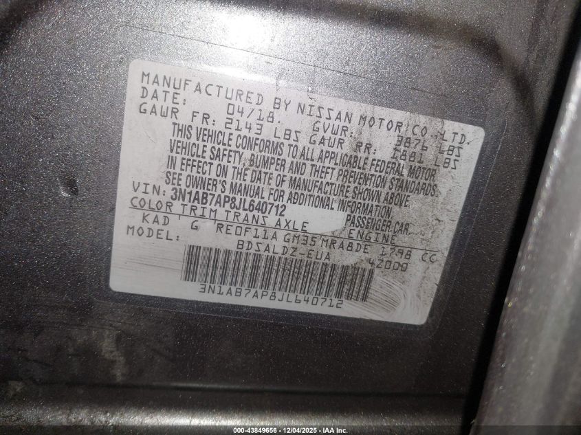 2018 NISSAN SENTRA 2018 року Бензин, 1.8, Передній привід, vin - 3N1AB7AP8JL640712 з США