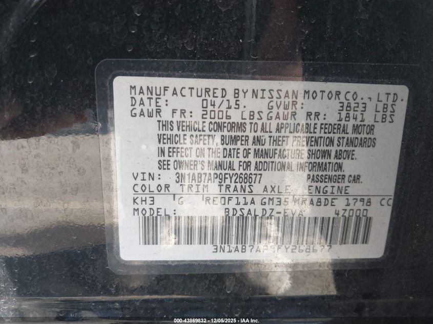 Колір ЧорнийЦиліндри 4Привід Передній привідVIN 3N1AB7AP9FY268677Стан Заводиться та їде (перевірено)Ушкодження Передня або задня AutoRIA