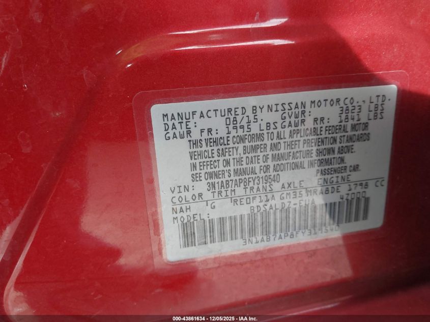 2015 NISSAN SENTRA 2015 року Бензин, 1.8, Передній привід, vin - 3N1AB7AP8FY319540 з США