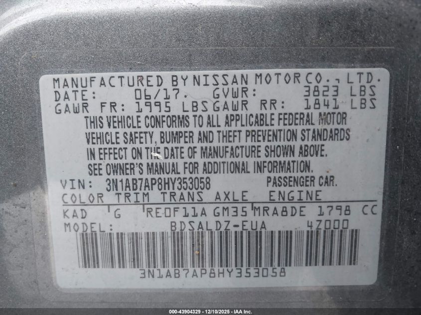 2017 NISSAN SENTRA 2017 року Бензин, 1.8, Передній привід, vin - 3N1AB7AP8HY353058 з США