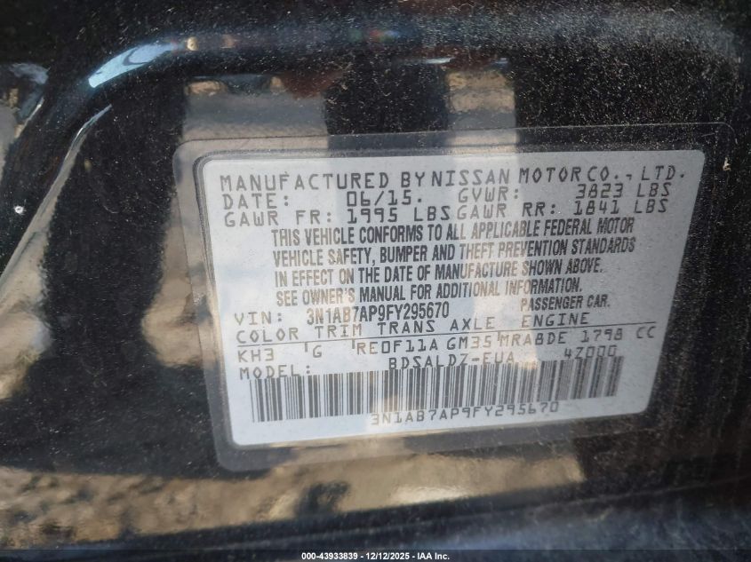 Колір ЧорнийЦиліндри 4Привід Передній привідVIN 3N1AB7AP9FY295670Стан Заводиться та їде (перевірено)Ушкодження Звичайний зносДата аукціону 2025-12-19 AutoRIA