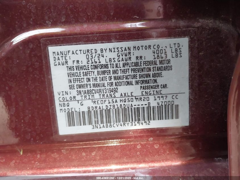 2024 NISSAN SENTRA 2024 року Бензин, 2.0, Передній привід, vin - 3N1AB8CV4RY319492 з США