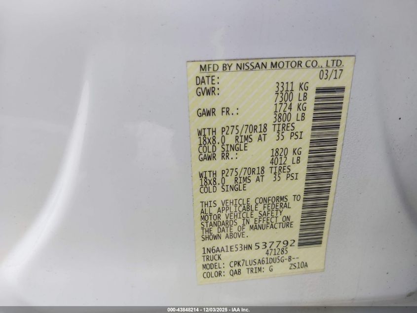 2017 NISSAN TITAN 2017 року Бензин, 5.6, Повний привід, vin - 1N6AA1E53HN537792 з США