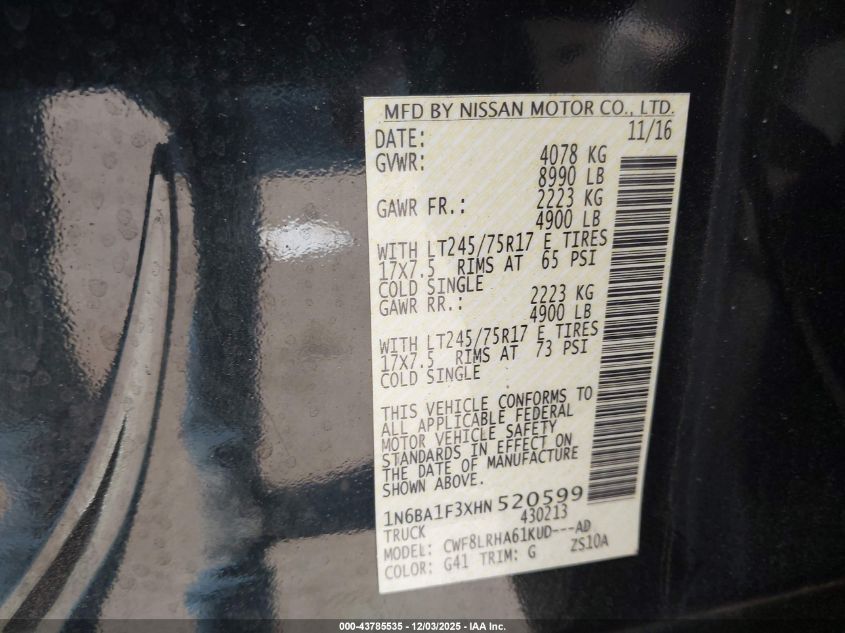 2017 NISSAN TITAN 2017 року Дизель, 5.0, Повний привід, vin - 1N6BA1F3XHN520599 з США