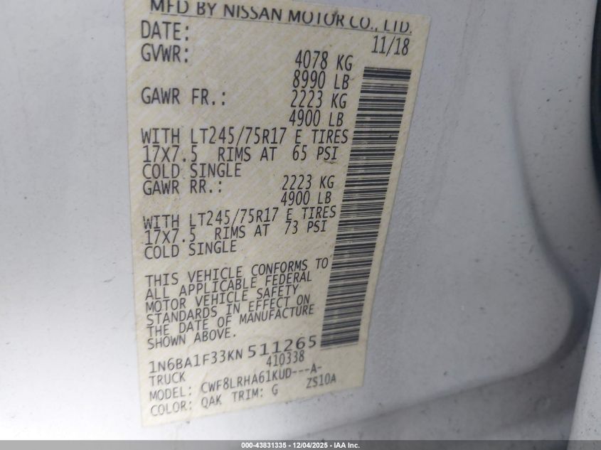 2019 NISSAN TITAN 2019 року Дизель, 5.0, Повний привід, vin - 1N6BA1F33KN511265 з США