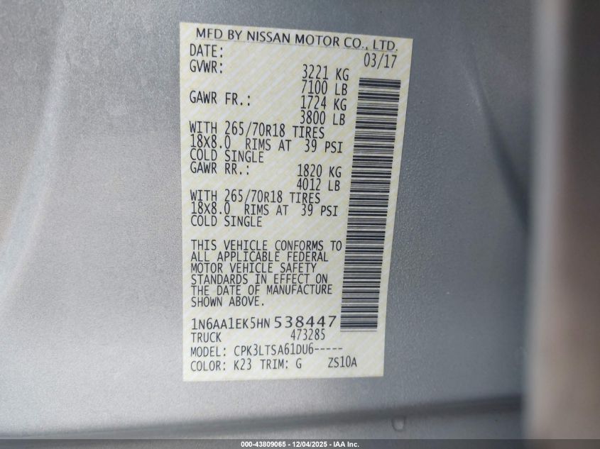 2017 NISSAN TITAN 2017 року Бензин, 5.6, , vin - 1N6AA1EK5HN538447 з США