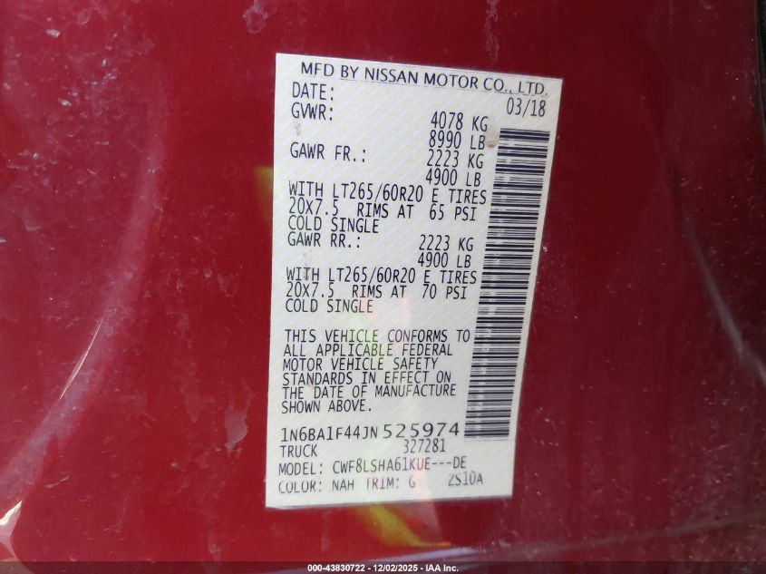 2018 NISSAN TITAN 2018 року Дизель, 5.0, Повний привід, vin - 1N6BA1F44JN525974 з США