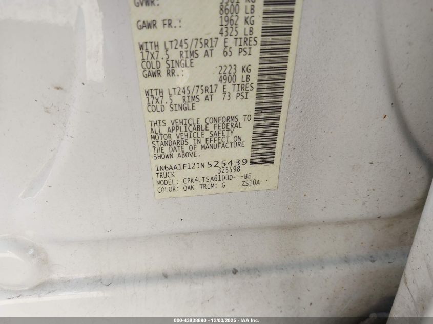 Колір БілийЦиліндри 8VIN 1N6AA1F12JN525439Стан Заводиться та їде (перевірено)Ушкодження Передня або задня AutoRIA