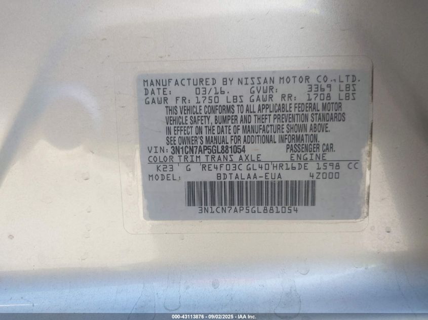 2016 NISSAN VERSA 2016 року Бензин, 1.6, Передній привід, vin - 3N1CN7AP5GL881054 з США