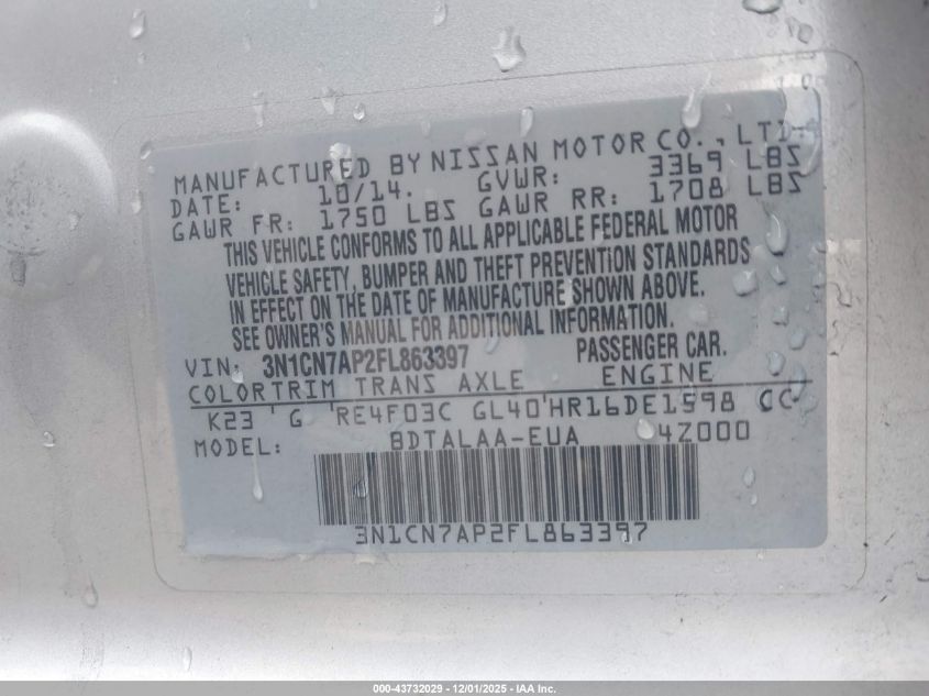 Колір СрібнийЦиліндри 4Привід Передній привідVIN 3N1CN7AP2FL863397Стан Заводиться та їде (перевірено)Ушкодження ЗадняДата аукціону 2025-12-15 AutoRIA