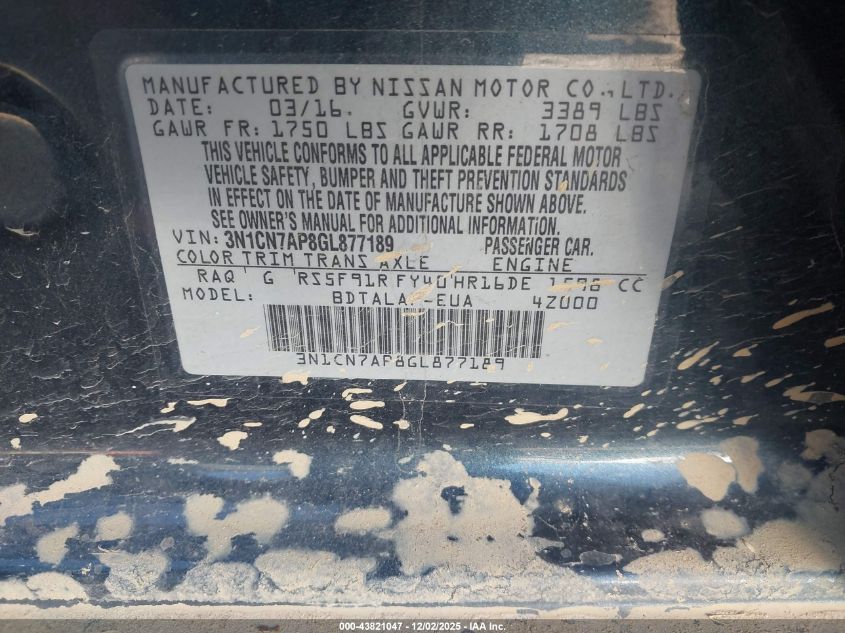 2016 NISSAN VERSA 2016 року Бензин, 1.6, Передній привід, vin - 3N1CN7AP8GL877189 з США