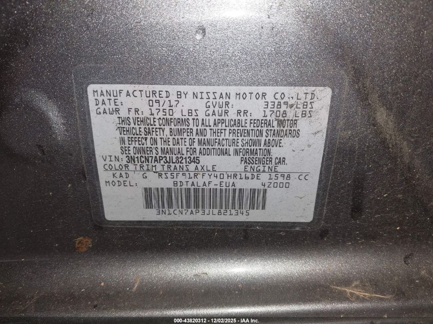 2018 NISSAN VERSA 2018 року Бензин, 1.6, Передній привід, vin - 3N1CN7AP3JL821345 з США
