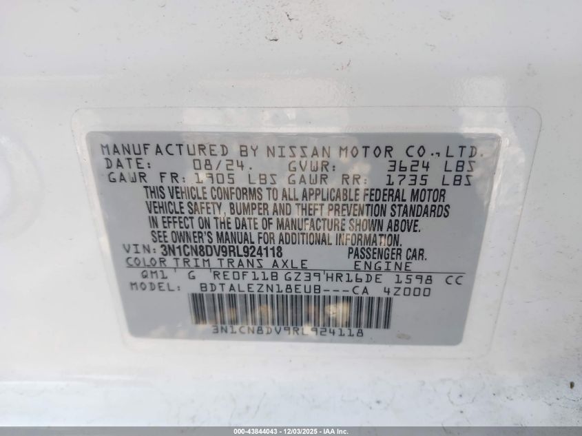 2024 NISSAN VERSA 2024 року Бензин, 1.6, Передній привід, vin - 3N1CN8DV9RL924118 з США
