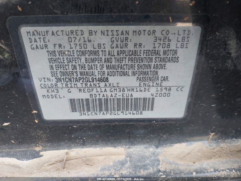 2016 NISSAN VERSA 2016 року Бензин, 1.6, Передній привід, vin - 3N1CN7AP2GL914608 з США