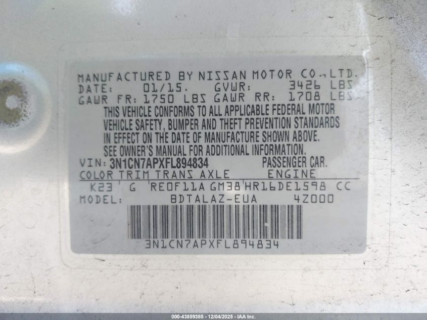 2015 NISSAN VERSA 2015 року Бензин, 1.6, Передній привід, vin - 3N1CN7APXFL894834 з США