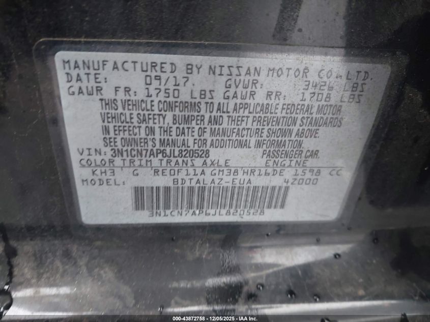 2018 NISSAN VERSA 2018 року Бензин, 1.6, Передній привід, vin - 3N1CN7AP6JL820528 з США