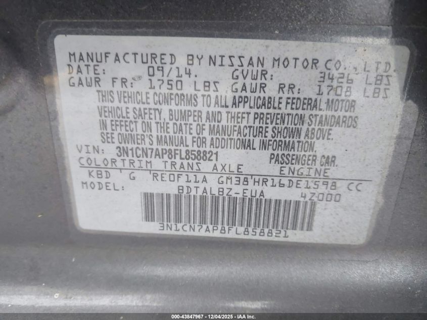 2015 NISSAN VERSA 2015 року Бензин, 1.6, Передній привід, vin - 3N1CN7AP8FL858821 з США