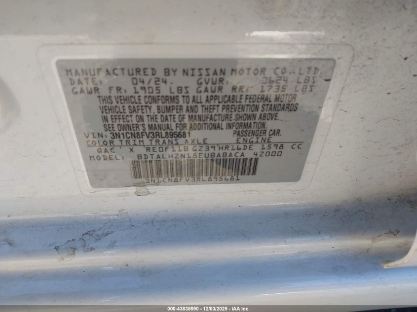 2024 NISSAN VERSA 2024 року Бензин, 1.6, Передній привід, vin - 3N1CN8FV3RL895681 з США