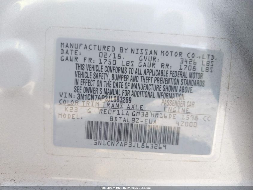 2018 NISSAN VERSA S