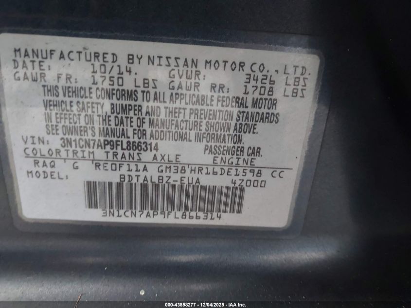2015 NISSAN VERSA 2015 року Бензин, 1.6, Передній привід, vin - 3N1CN7AP9FL866314 з США