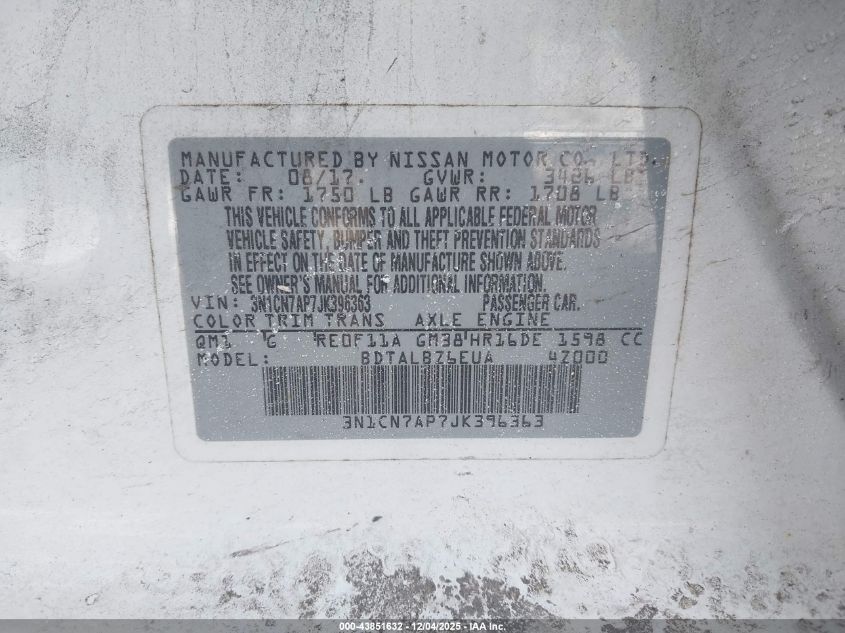 2018 NISSAN VERSA 2018 року Бензин, 1.6, Передній привід, vin - 3N1CN7AP7JK396363 з США