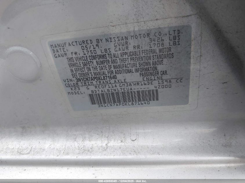 2019 NISSAN VERSA 2019 року Бензин, 1.6, Передній привід, vin - 3N1CN7AP0KL871640 з США