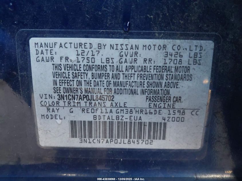 Колір СинійЦиліндри 4Привід Передній привідVIN 3N1CN7AP0JL845702Стан Заводиться та їде (перевірено)Ушкодження Низ AutoRIA